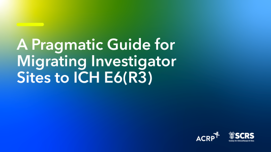 Developed jointly by ACRP and SCRS, this report guides sites through the practical transition from ICH E6(R2) to R3, focusing on updating procedures, processes, and technology to meet new requirements. The report provides essential information for sites on updates to informed consent, delegation, records management, electronic systems, sponsor collaboration, budgeting, and data governance.
