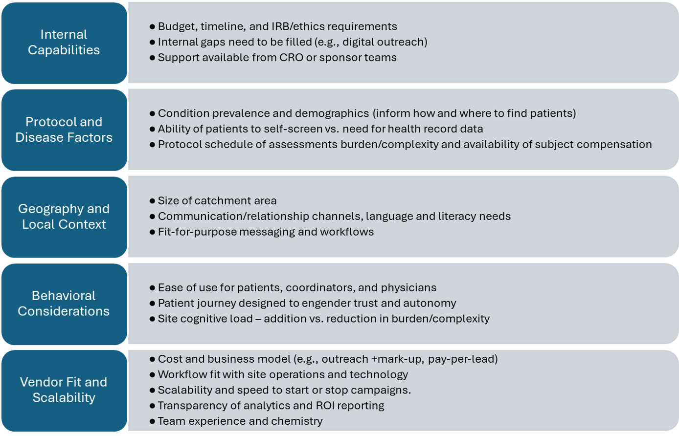 When evaluating options for recruitment support, it helps to think about your needs from several different perspectives. Figure 2 provides a sample approach to selecting the right partner for your study and organization.