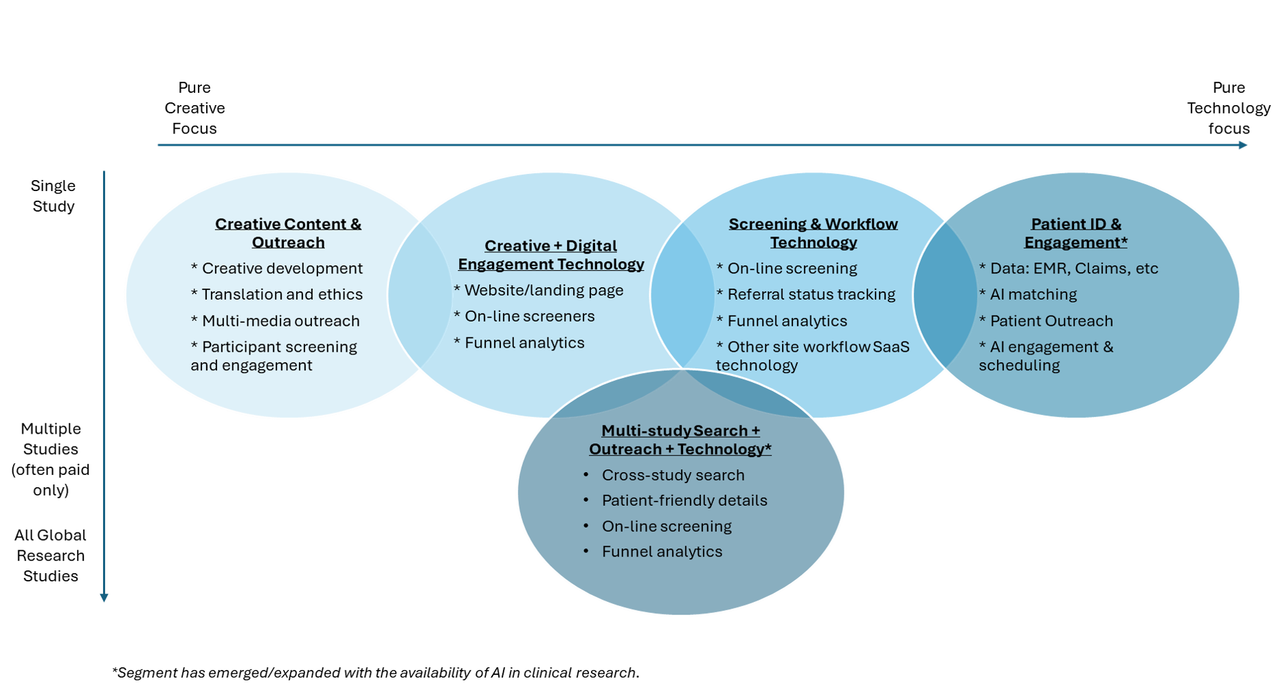 The landscape for solutions to accelerate clinical trial recruitment is best understood as a spectrum, ranging from pure creative agency work to technology-driven solutions, with many hybrids in between. As seen in Figure 1, traditionally, recruitment solutions were based on creative work including single-study content pages, communication messages, IRB approval and translation. As technology became more prevalent, offerings quickly evolved to include on-line screeners for patient self-qualification and platforms to track the status of potential participants. Over the past year, AI advances have further expanded the availability of recruitment technology to increase the use of data-driven patient identification. At the same time, the availability of large language models have also enabled the introduction of a new access of competition at scale; namely, patient-centric multi-study search.